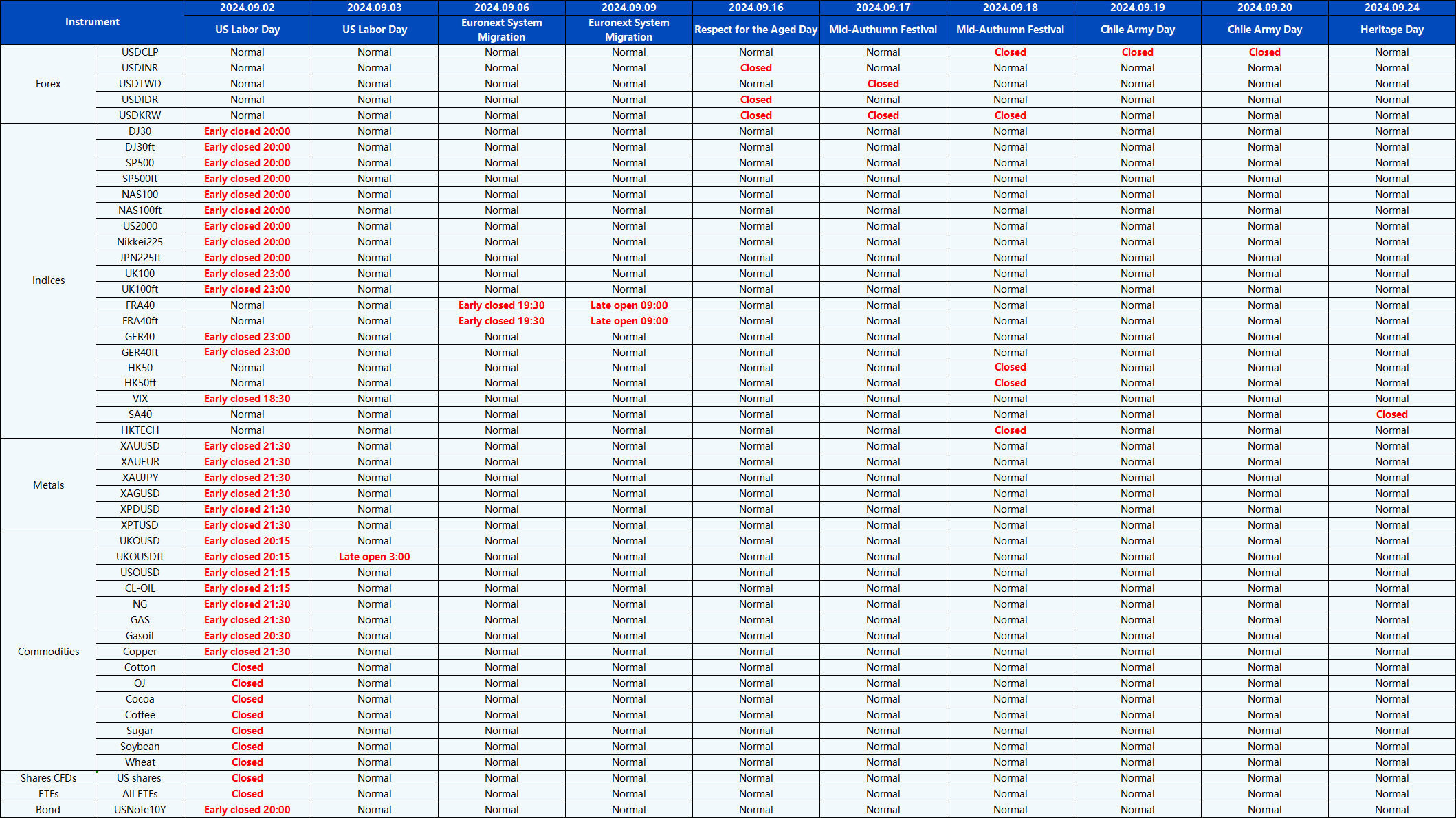 Please be advised that the following instruments’ trading hours and market session times will be affected by the upcoming September holidays.